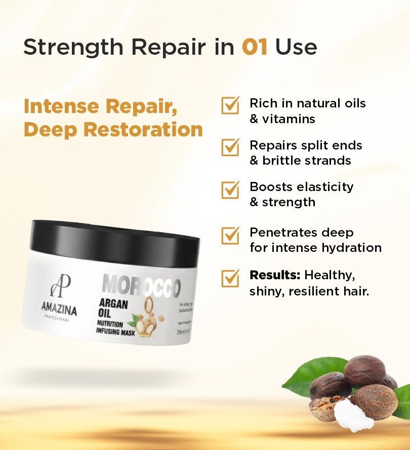 The Amazina Professional Hair Mask is a rich, restorative treatment designed to repair damaged hair, reduce breakage, and restore natural vitality. Formulated in Canada with nourishing oils, proteins, and strengthening ingredients, this mask penetrates deep into the hair shaft for long-lasting smoothness and resilience.